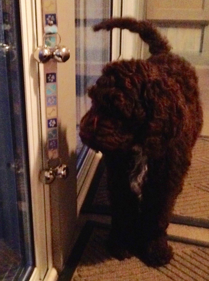 Housetraining Pete includes daily reinforcement that Ringing the Bells on the door signify that he is going outside to do his business. Our breeder sent us home with bells and the instruction to ring them consistently. She promised that eventually Pete would ring the bells to let us know when he needed to go out. Simple enough!
